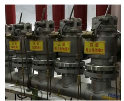 2)選擇閥、驅(qū)動(dòng)氣瓶未設(shè)置區(qū)域標(biāo)志;滅火劑鋼瓶、驅(qū)動(dòng)氣瓶容器閥和選擇閥手動(dòng)控制與應(yīng)急操作部位缺少警示標(biāo)志和鉛封;【圖示2】